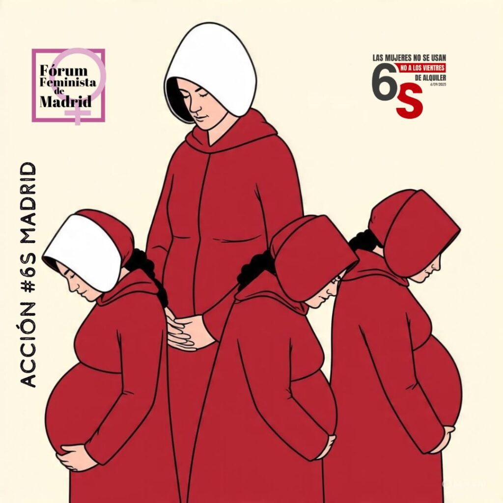 Estamos aquí para denunciar que esta práctica criminal, ilegal y prohibida en España está siendo hoy -aquí y ahora- promocionada impunemente por la industria que se lucra a manos llenas de nuestra maternidad y de la venta de nuestros hijos e hijas; que está siendo blanqueada por quienes soslayan la legalidad vigente y acuden